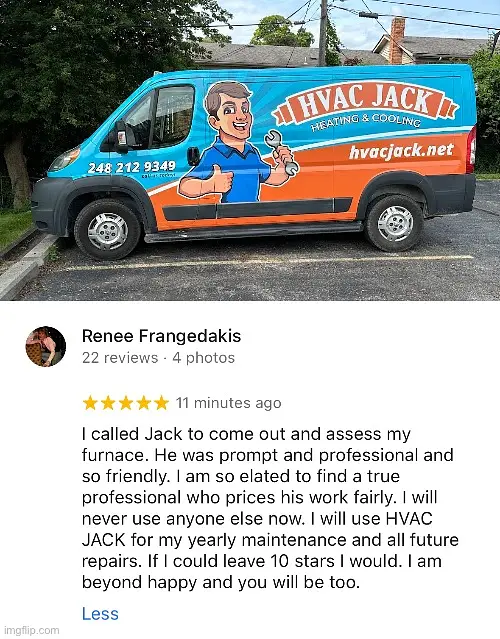 I recently had HVAC Jack replace my home furnace in Rochester Hills, and I couldn't be more satisfied with his service. From start to finish, Jack and his team were professional, efficient, and thorough. Jack quickly assessed my needs and replaced the furnace with minimal disruption to my daily routine. The communication throughout the entire process was excellent—clear, timely updates, and they answered all my questions with great detail. Jack installed a new Trane furnace which has been working wonderfully. The installation was seamless, and
